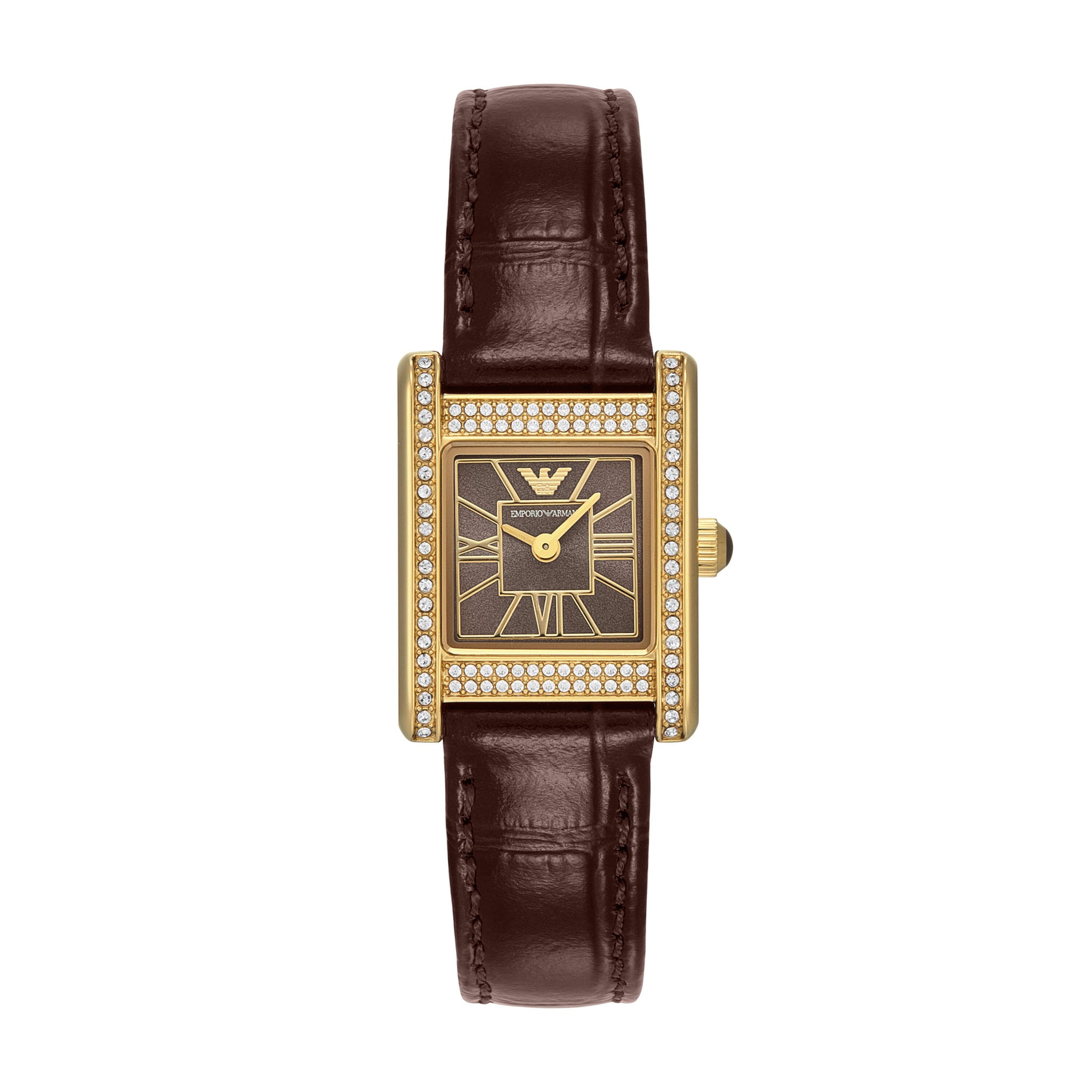 Emporio Armani's 20 x 26mm watch showcases a rich brown sunray dial with Roman numeral indexes in a gold-tone stainless steel case with crystal embellishment. The dark brown, crocodile patterned leather strap ensures a refined look for your collection.