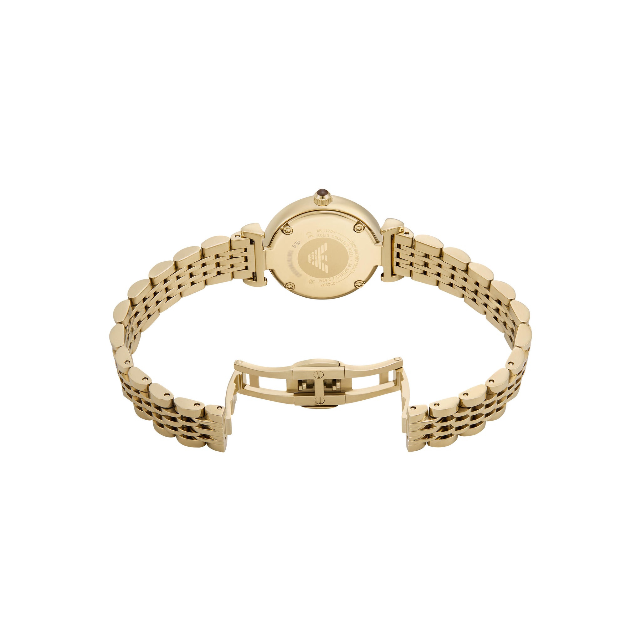 Emporio Armani's 28MM gold-tone watch features an exotic tiger's eye stone dial. This semi-precious stone dial paired with gold-tone Roman numeral indexes is the perfect complement to the gold-tone stainless steel case and intricate bracelet.