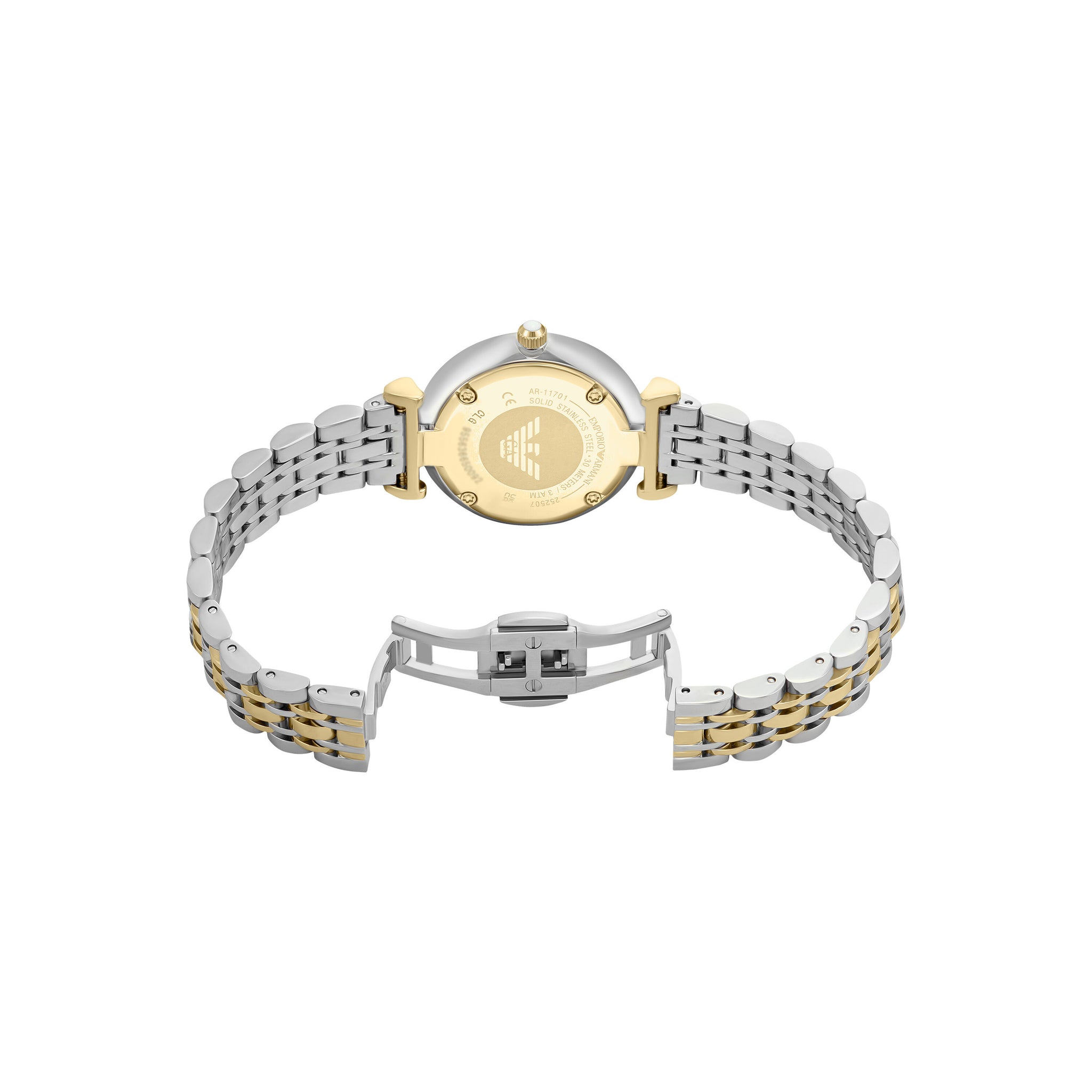 Emporio Armani's 32MM watch features a champagne sunray dial with a crystal inlay around the outer rim. Gold-tone Roman numeral indexes adorn the dial set on a two-tone stainless steel case and intricate bracelet.