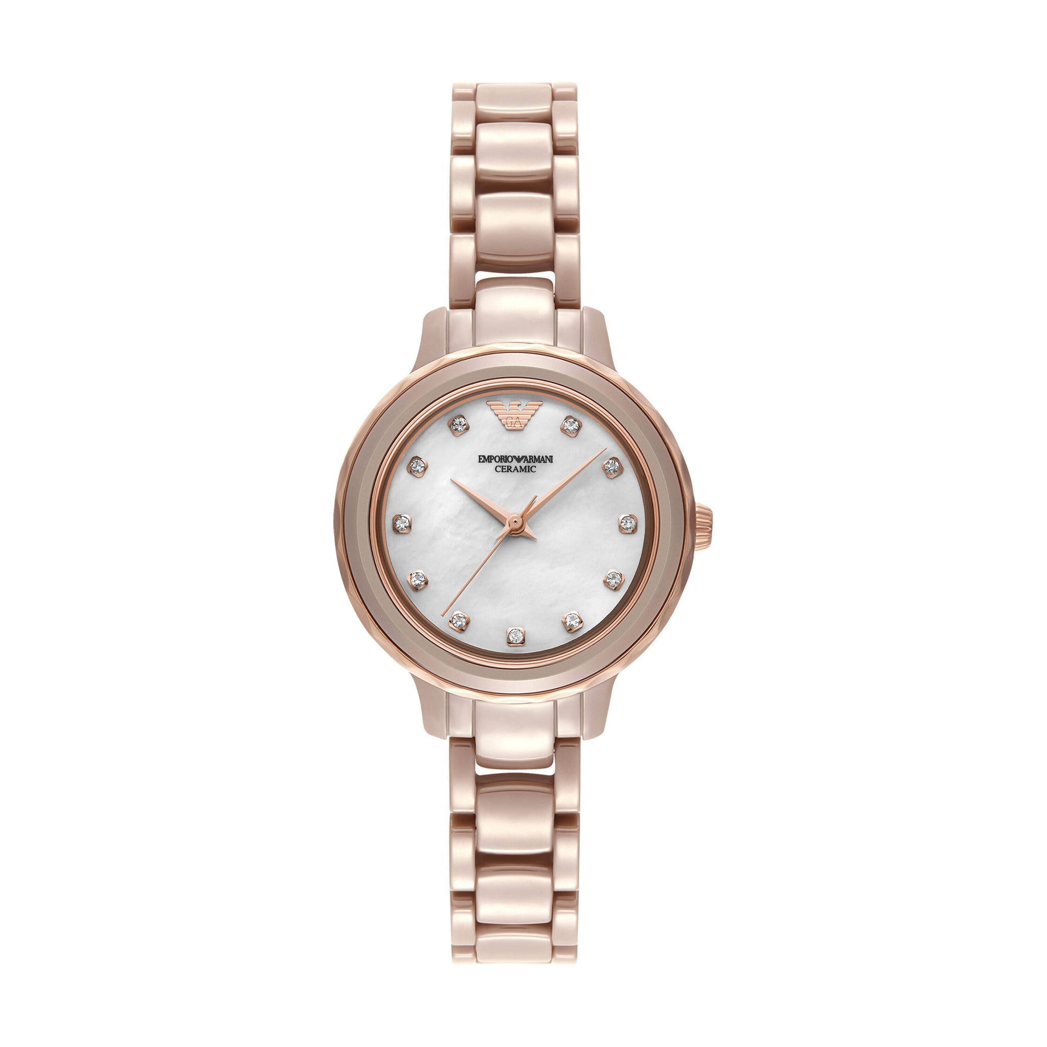 Crafted entirely from sand-colored ceramic, this watch showcases a white mother-of-pearl dial with crystal indexes featuring rose gold-tone accents. The scalloped ceramic bezel with rose-gold tone detailing and matching ceramic bracelet make for a visual delight that is perfect for any woman.
