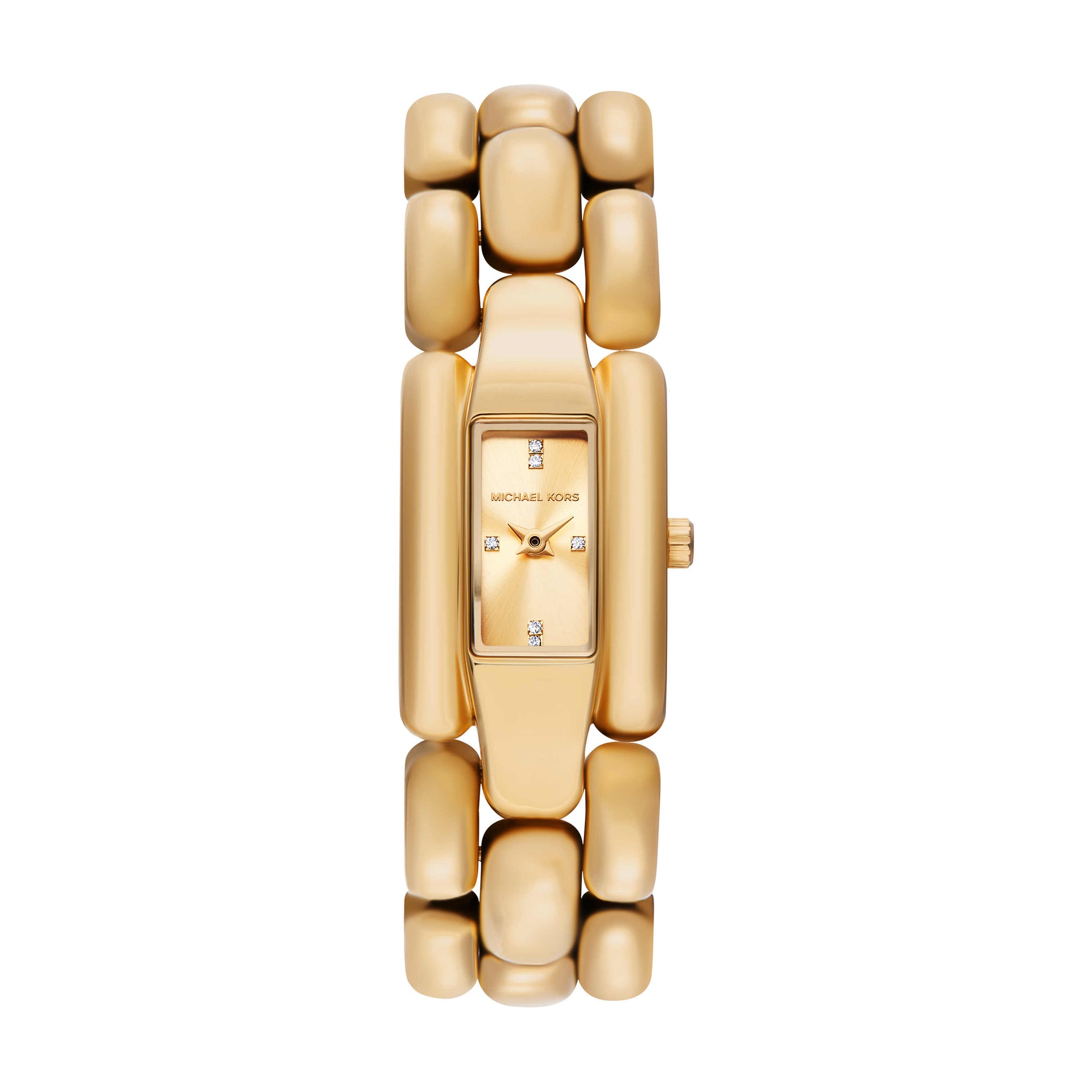 Defined by sculptural half-moon chain links, the Hally watch offers a sleek, jewelry-inspired take on timekeeping. Its gold-tone stainless steel bracelet is paired with a refined rectangular dial for a modern, minimalist finish. Wear it solo or stacked for effortless elegance.