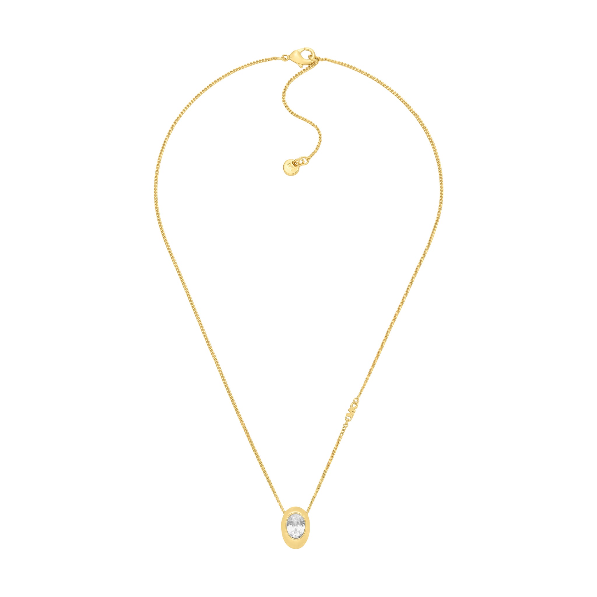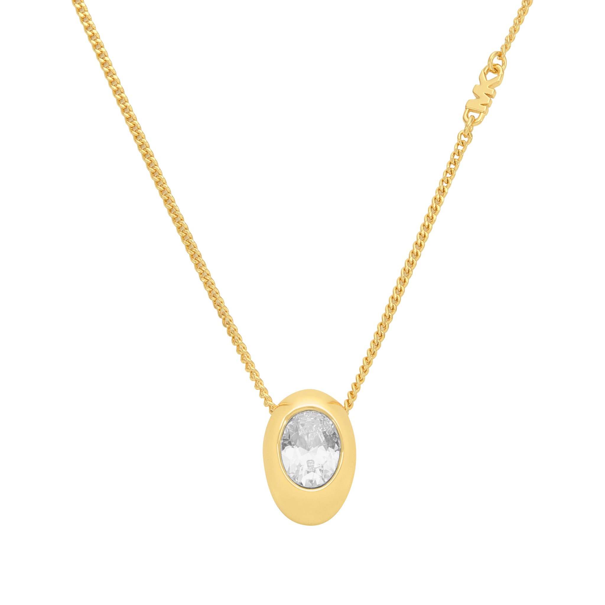 Complete your ensemble with the exquisite charm of our Kors Brilliance collection, a true testament to understated luxury. This stunning pendant necklace features a clear oval cut cubic zirconia stone set in a modern bezel. This necklace is secured with a spring ring closure making it suitable for everyday wear.