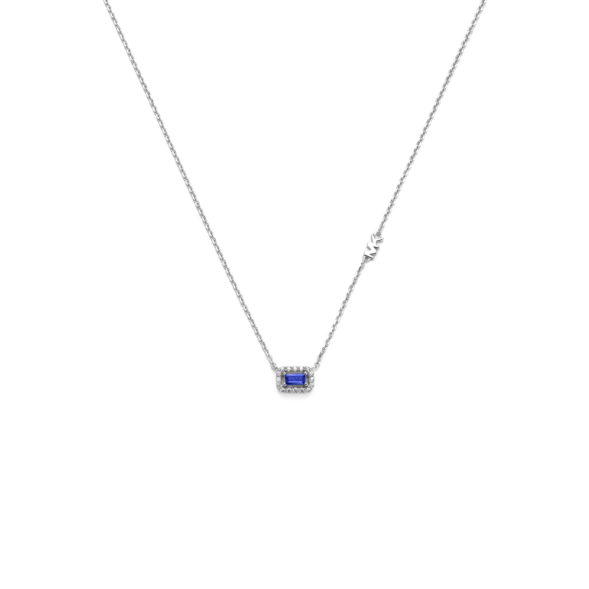 Elevate your everyday elegance with Kors Brilliance, your key to effortless luxury. Crafted from sterling silver and plated in rhodium, this emerald cut sapphire colored cubic zirconia necklace will elevate any look. Pair it with the matching earrings for a cohesive ensemble that radiates sophistication and style from every angle.