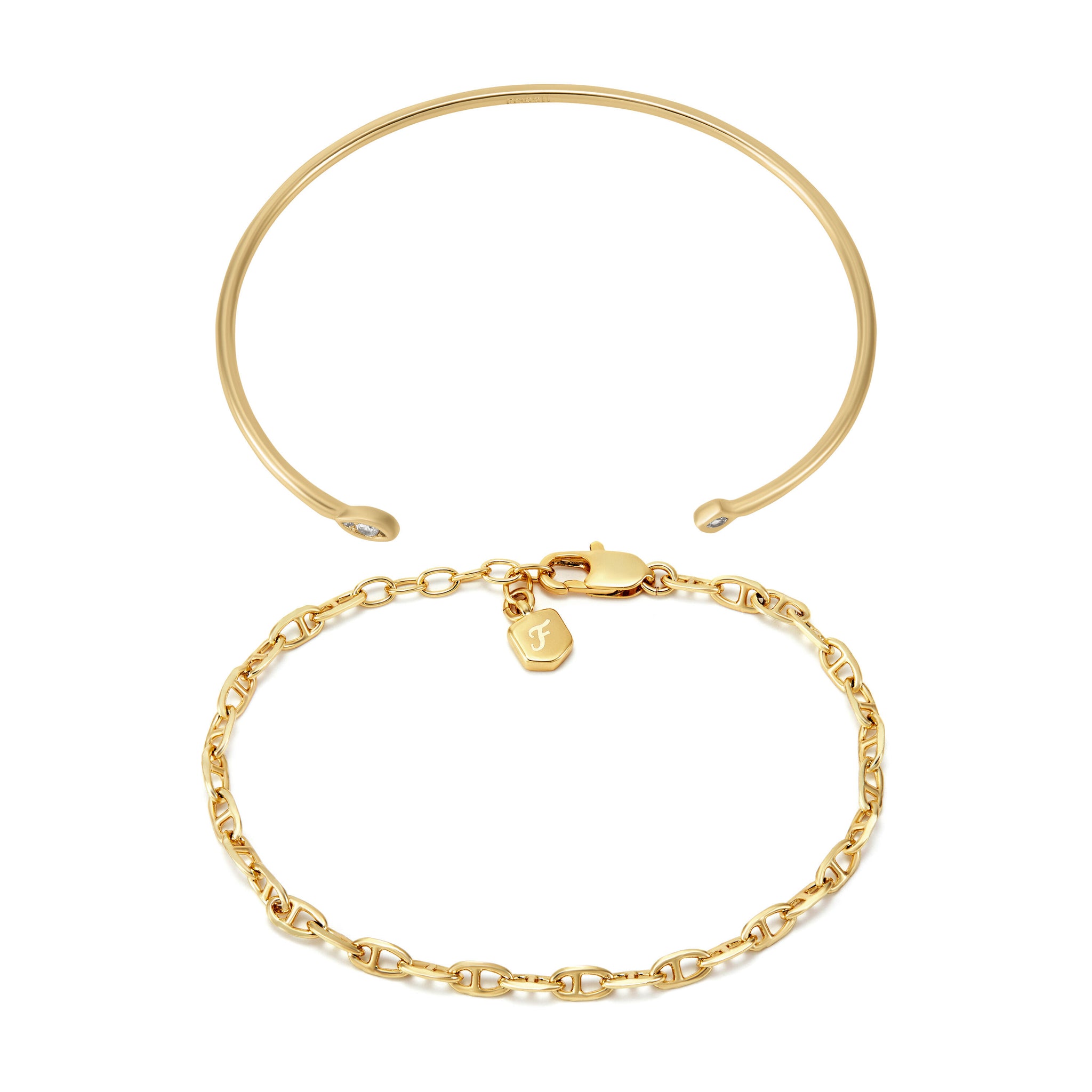 This gold-tone bracelet gift set combines refined details and versatile design. The first bracelet features our Heritage anchor chain with a lobster clasp closure. The second bracelet is a sleek, open cuff design with mismatched crystals stationed on either side. Both pieces showcase a polished finish for a cohesive look that pairs seamlessly together or stands out individually.